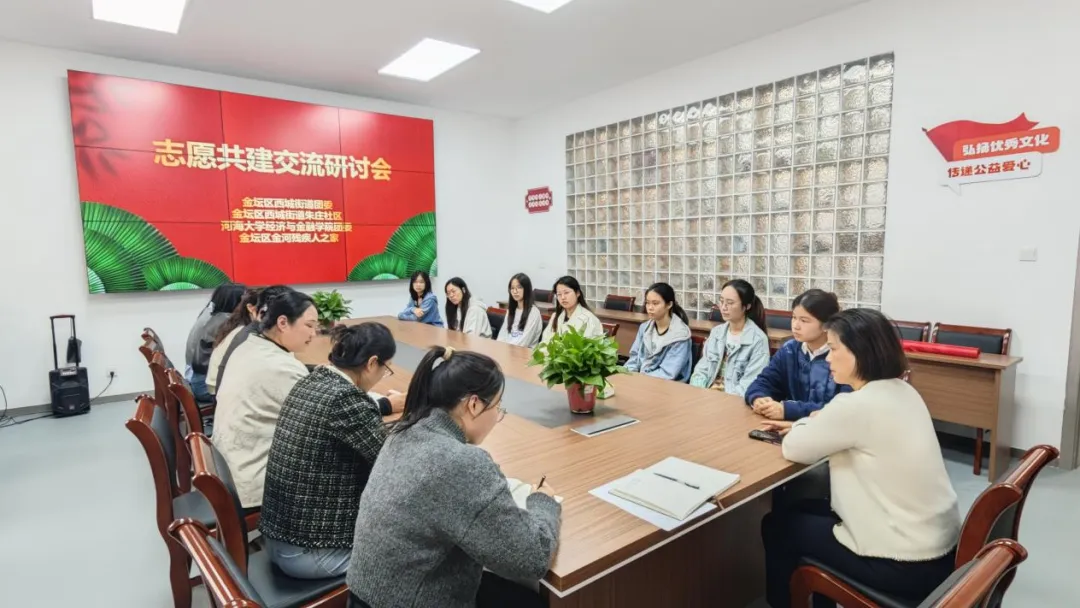 金坛区西城街道团委、金坛区汉服文化协会、朱庄社区的相关负责人与学院师生开展了志愿共建交流研讨会。与会四方介绍了共建需求、场地资源、师生资源、志愿服务项目等,深度研讨了促进校地融合的具体举措。大家一致认为要充分发挥各自优势,加强校地交流融合,通过开展形式多样的志愿服务活动,打造志愿服务品牌,助力残障人群服务、非遗文化传承。