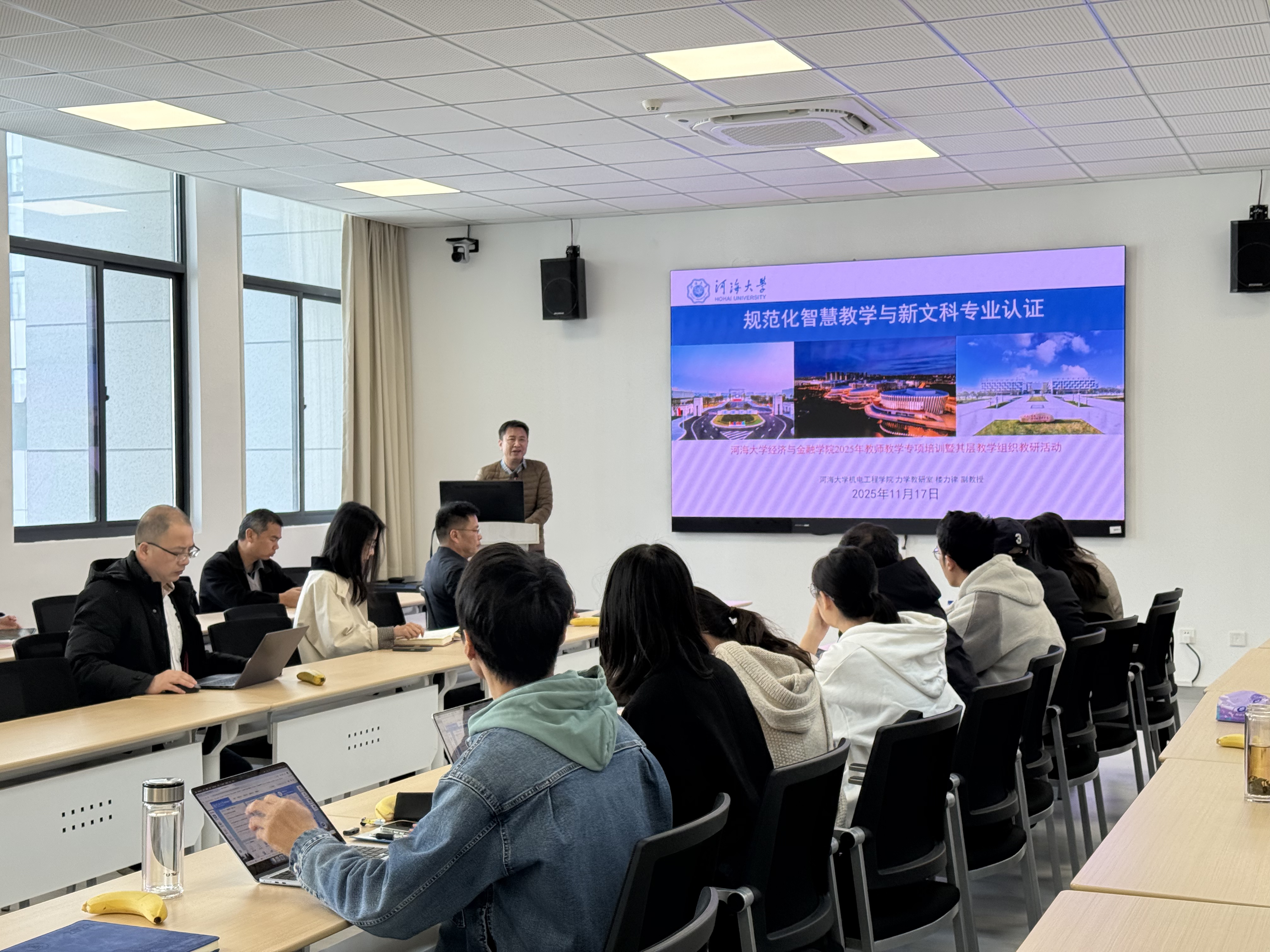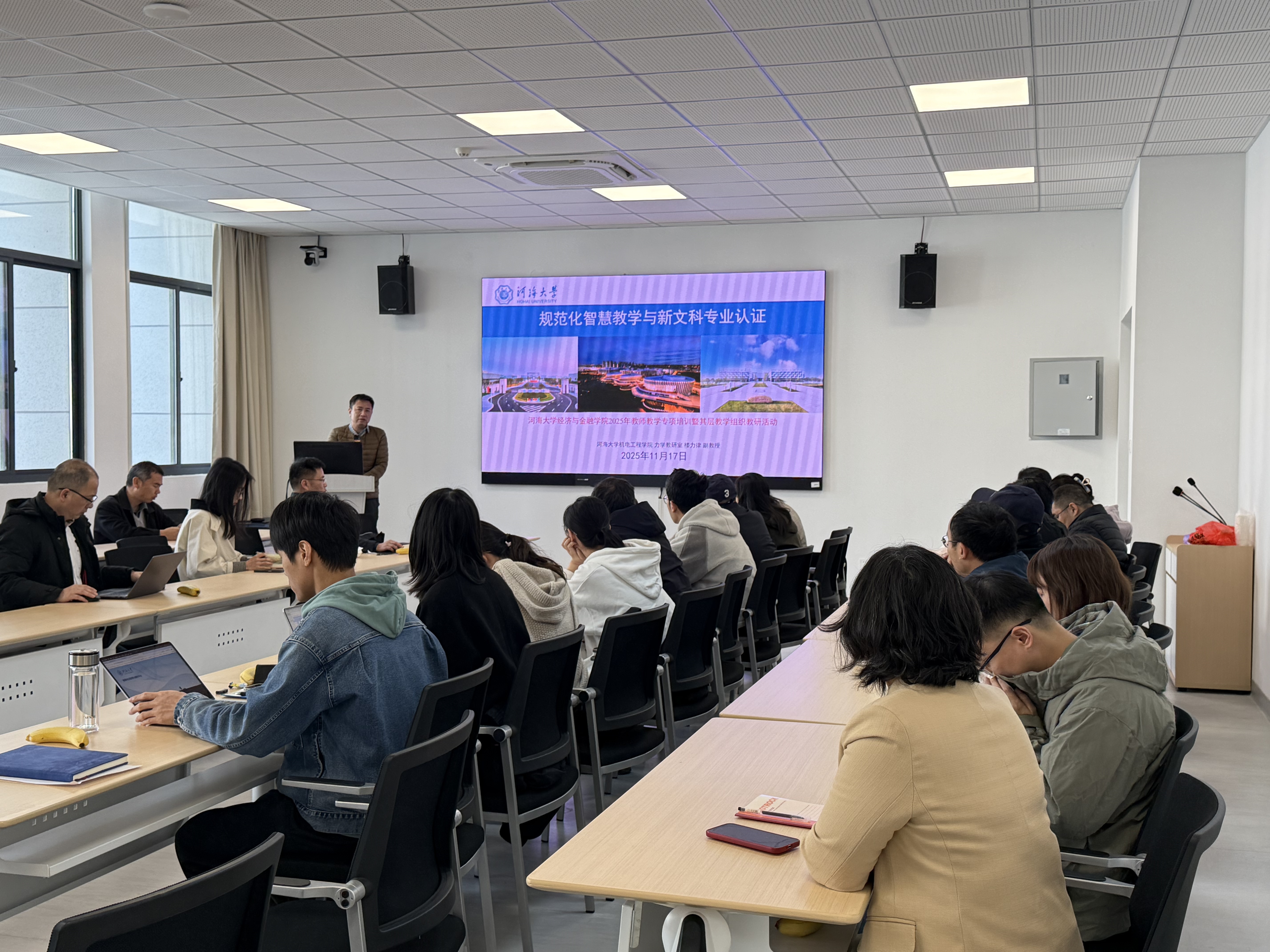 11月18日,麻豆app 2025年教师教学专项培训暨基层教学组织教研活动在33号楼304会议室举行。本次活动以规范化智慧教学与新文科专业认证为主题,邀请麻豆app 优秀主讲教师、机电工程学院楼力律副教授主讲。活动由学院副院长李祎雯主持,国贸系、经济系及金融系近三十位教师参加,共同聚焦人工智能赋能教学这一前沿领域及新文科认证问题。